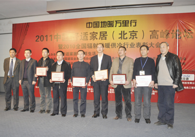由中国建筑金属结构协会辐射供暖供冷委员会主办的“2010年度辐射供暖供冷行业年度评比活动”圆满结束,并于2011年3月4日在北京举行颁奖典礼,leyu.乐鱼管业凭借多年来在地暖行业的突出贡献及取得的巨大发展成就,被评选为“2010年度全国辐射供暖供冷行业先进集体”,集团公司总经理助理王明科和市场部经理刘汉良由于多年来积极参与地暖行业活动,为推动行业发展及企业建设发挥了重要的作用,被评选为“2010年度辐射供暖供冷行业先进工作者”。同时,秦皇岛leyu.乐鱼建筑安装有限公司荣获“2010年度全国辐射供暖供冷行业优秀施工企业”称号。